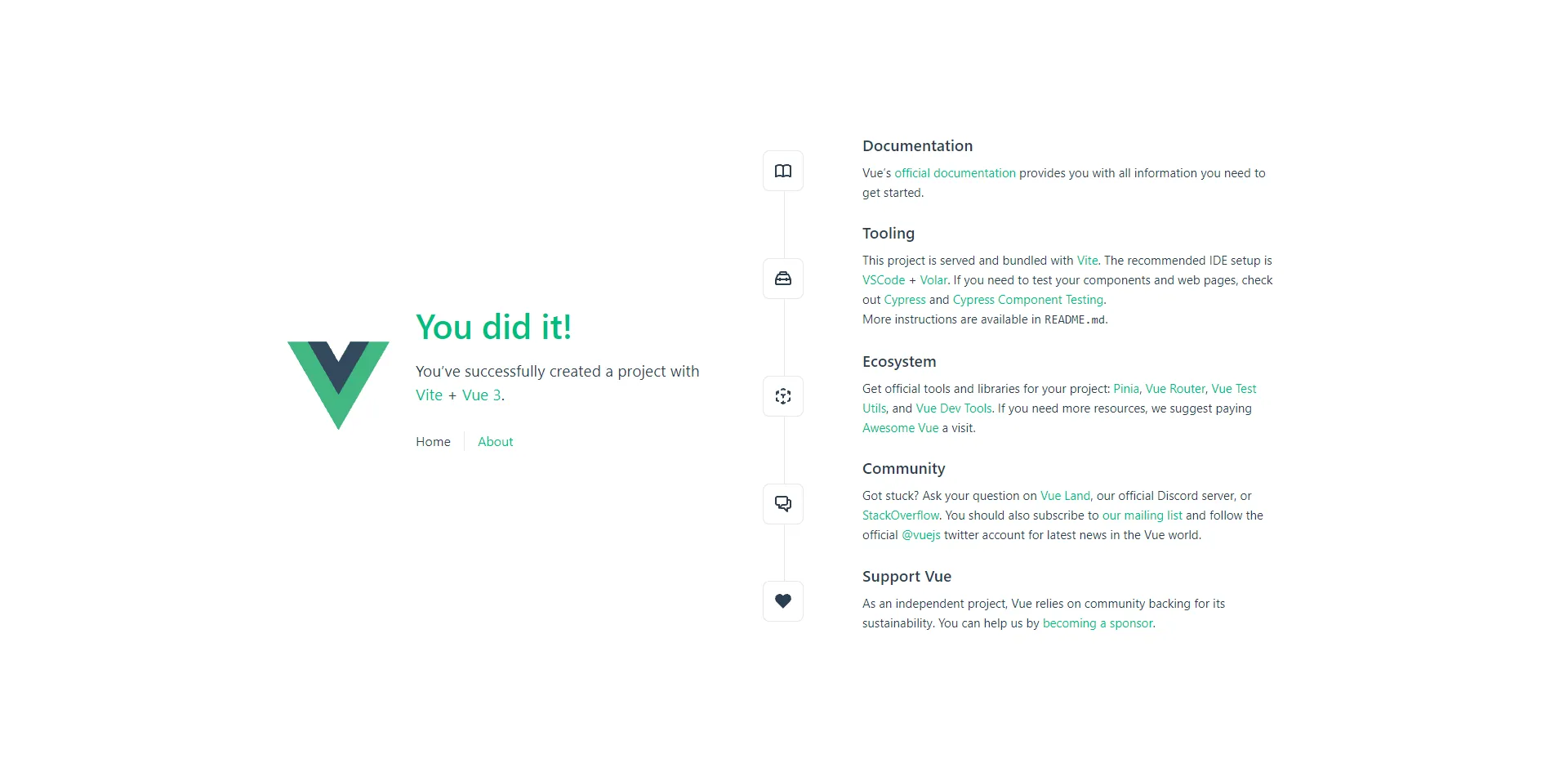 ➜ press h to show help键盘按住Ctrl,鼠标左击Local:后面的链接即可在浏览器中打开运行的项目了。到此为止,Vite+Vue3的项目便创建完成了。