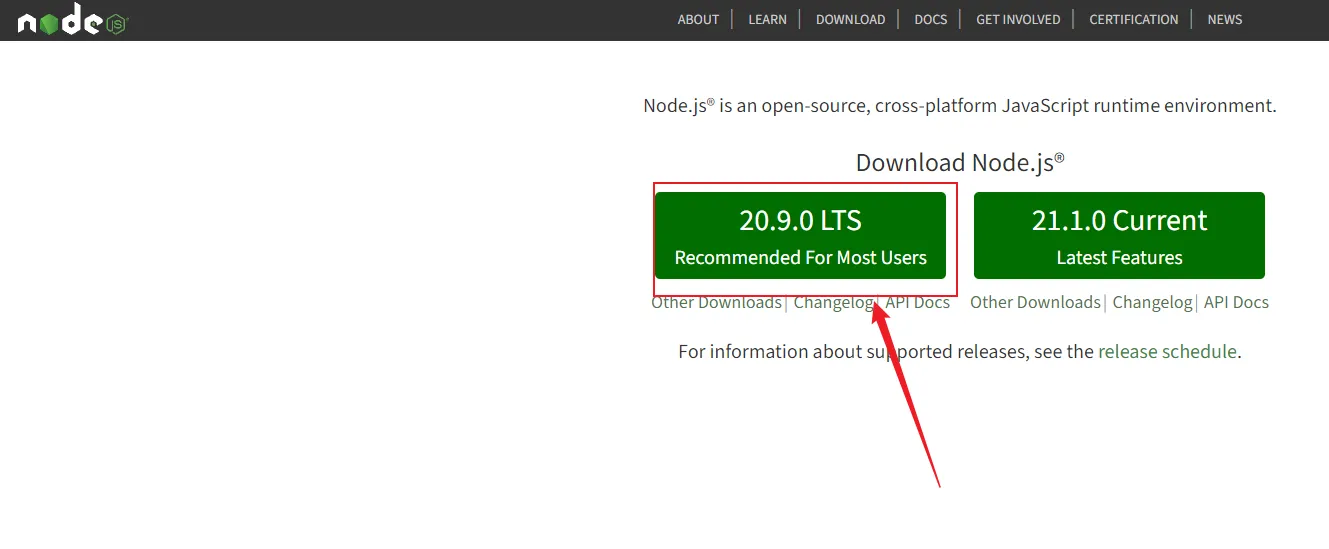 来到Node.js官网,下载如图所示LTS版本(长期支持版本)。下载后直接打开exe安装包 ,根据示意next下一步完成安装。