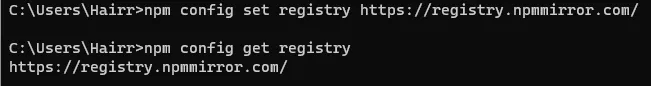 npm config set registry https://registry.npmmirror.com/此命令不会有任何反馈,可以输入以下命令判断是否成功: